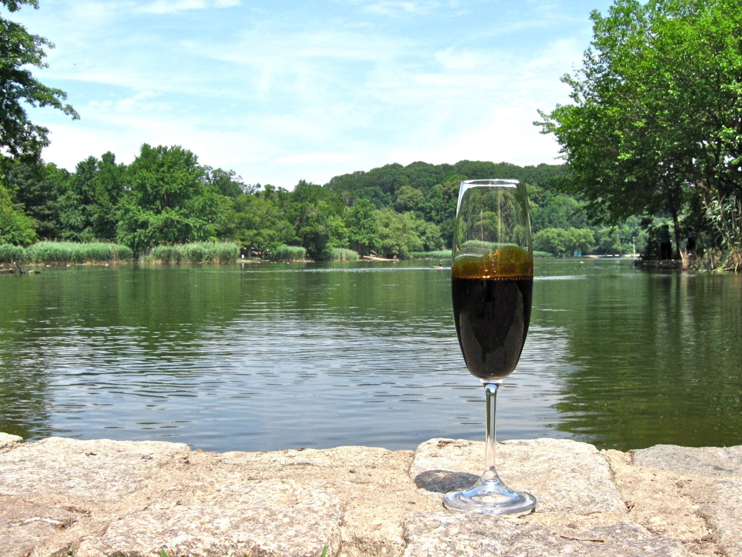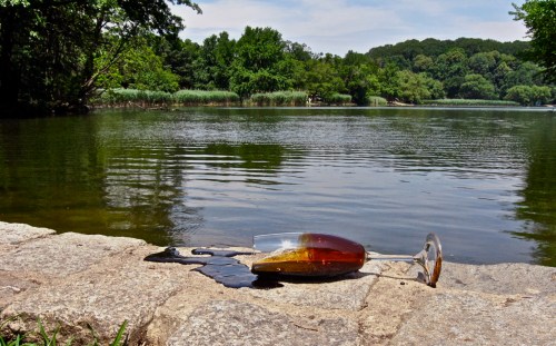 The glass is a champagne flute from Williams Sonoma. I photographed it on the southern edge of the pond in Prospect Park, Brooklyn. The pond is home to a lot of turtles. Fish are stocked and then fished out by the people who live in the neighborhood. Macy’s sponsors an annual fishing tournament in the park. Swans, geese, ducks and other birds make the pond home, for at least part of the year. Of late, there has been a series of mysterious animal deaths in the park, prompting outrage and concern by folks all over the city. Comprehensive coverage of what started with an injury to John Boy the Swan, which later resulted in his death, can be found in Gothamist and in the Brooklyn Paper. Video of John Boy can be found here.