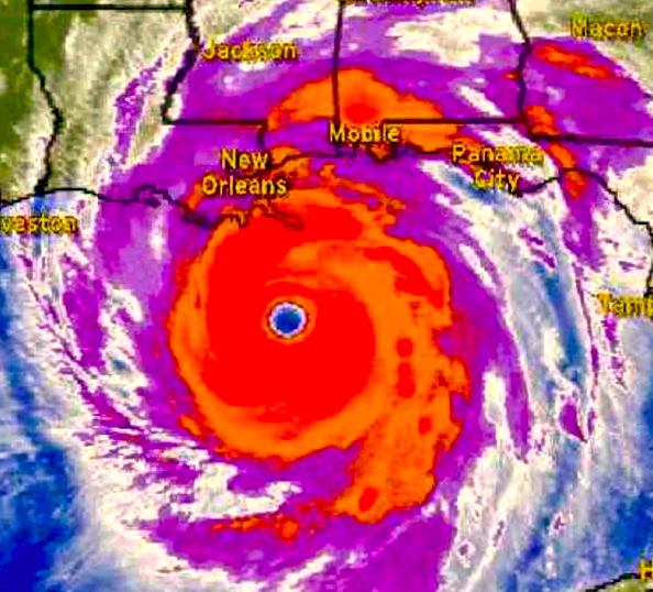 I took the satellite image of Hurricane Katrina from weather.com a few days before it made landfall. I was holed up in Dallas, Texas, at my mother-in-law’s. I happened to be there visiting, for reasons that had nothing at all to do with the storm. My parents went to my brother’s place in Nacogdoches, Texas—now they were storm refugees and only went home at the end of October, after 2 months in Texas. I kept that image of Katrina. In my anger over the storm and the abandonment of New Orleans, I made it the wallpaper of my computer desktop, not changing it for a couple of years.