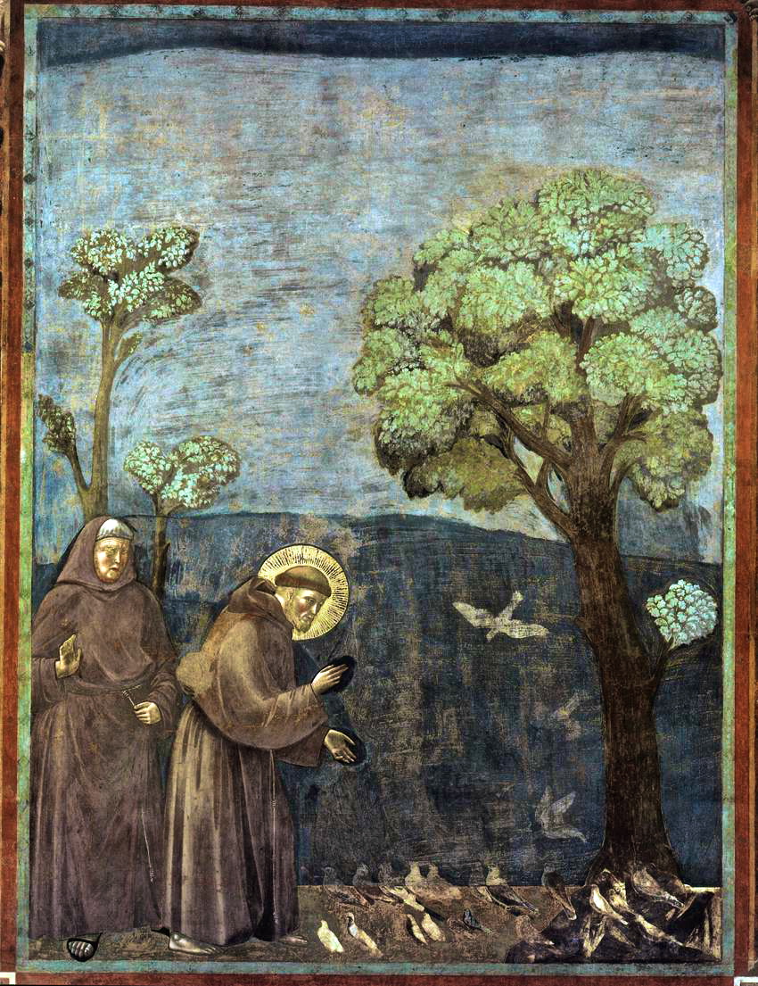 The images of “St. Francis Preaching to the Birds” and “St Francis Giving his Mantle to a Poor Man” are from the series of frescoes known as “The Legend of St. Francis,” which can be found in the Upper Church of the Basilica de San Francesco in Assisi, Italy. The frescoes date from 1297-1300 and are usually attributed to Giotto de Bondone, though they may have been done by several painters. These images are taken from The Atheneum, an organization devoted to making tools for art, scholarship and community-building available over the Web. They encourage people to post photographic images of art from around the world and then make it possible for others to repost and use that art in ways that will bring it to others.