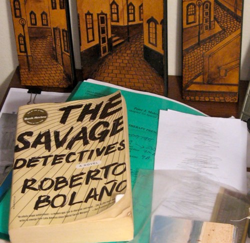 The photo of Bolaño’s The Savage Detectives was taken by the author on his nightstand. This is the normal appearance of my end table. I picked up the leather Brazilian street scenes in Salvador, Bahia, in 1993.